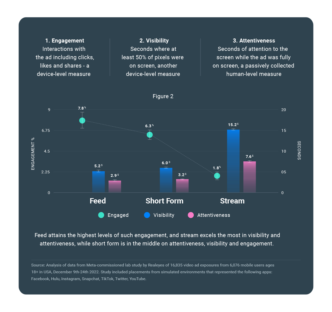 The study found that each digital environment also has its own characteristic behaviors. Feed attains the highest levels of engagement, and stream excels the most in visibility and attentiveness, while short form sees an intermediate level of attentiveness , visibility and engagement.