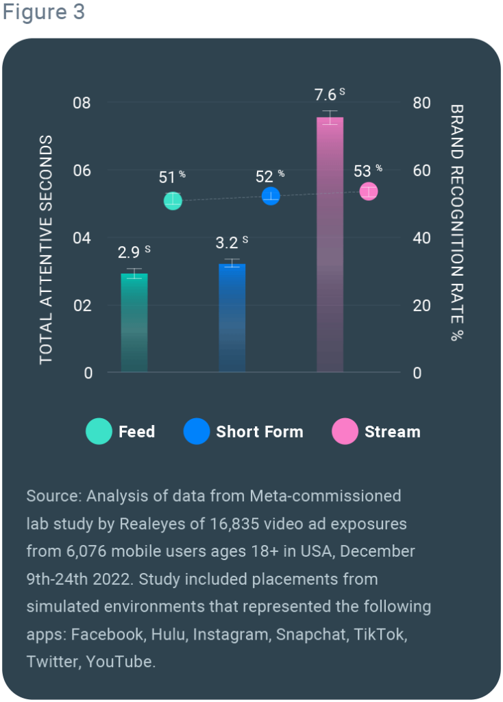 Feed and short form both generate about 0.16-0.17 brand recallers per second of attention, whereas stream produces only about .07 brand recallers each second.
